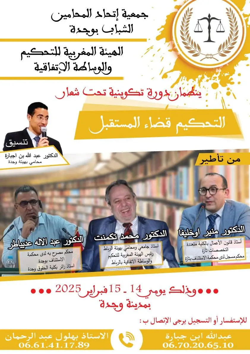 شاركها فيسبوك تويتر لينكدإن بينتيريست البريد الإلكتروني تنظم جمعية إتحاد المحامين الشباب و الهيئة المغربية للتحكيم والوساطة الإتفاقية دورة تكوينية تحت شعار “التحكيم قضاء المستقبل”