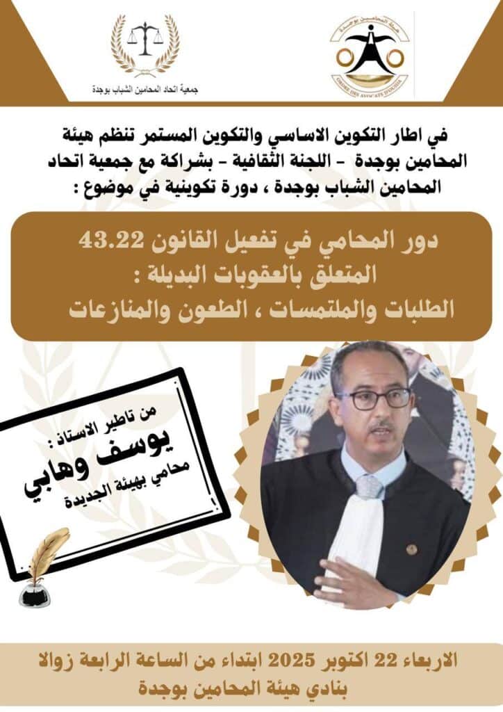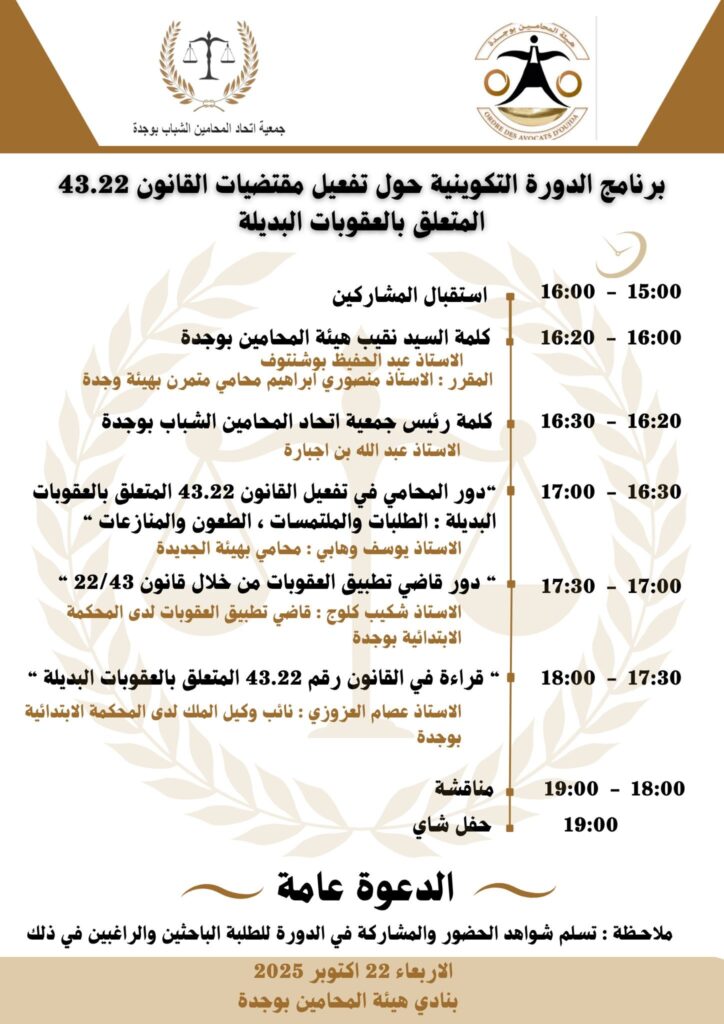 دورة تكوينية تروم معالجة القانون رقم 43.22 المتعلق بالعقوبات البديلة مرحبا بجميع الاساتذة الباحثين و الممارسين و الطلبة الباحثين من أجل نقاش قانوني و فقهي يجمع الممارسين و الباحثين لمطارحة موضوع جديد ووضع الإشكالات القانونية و الحلول المقترحة